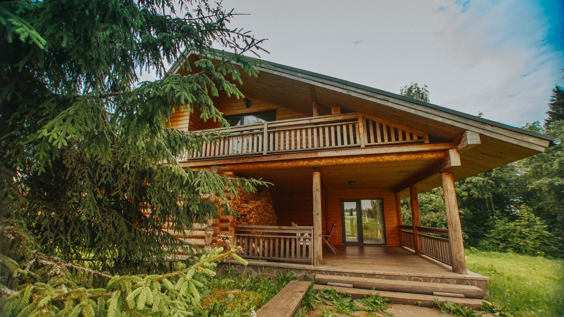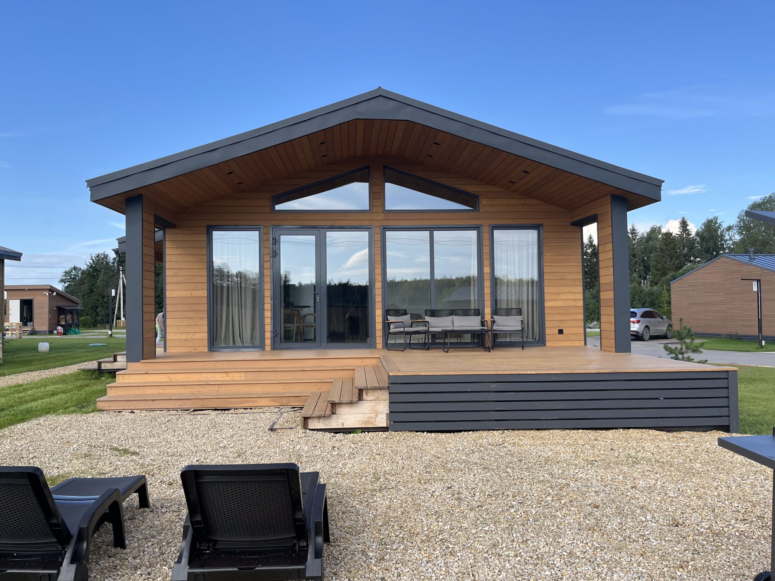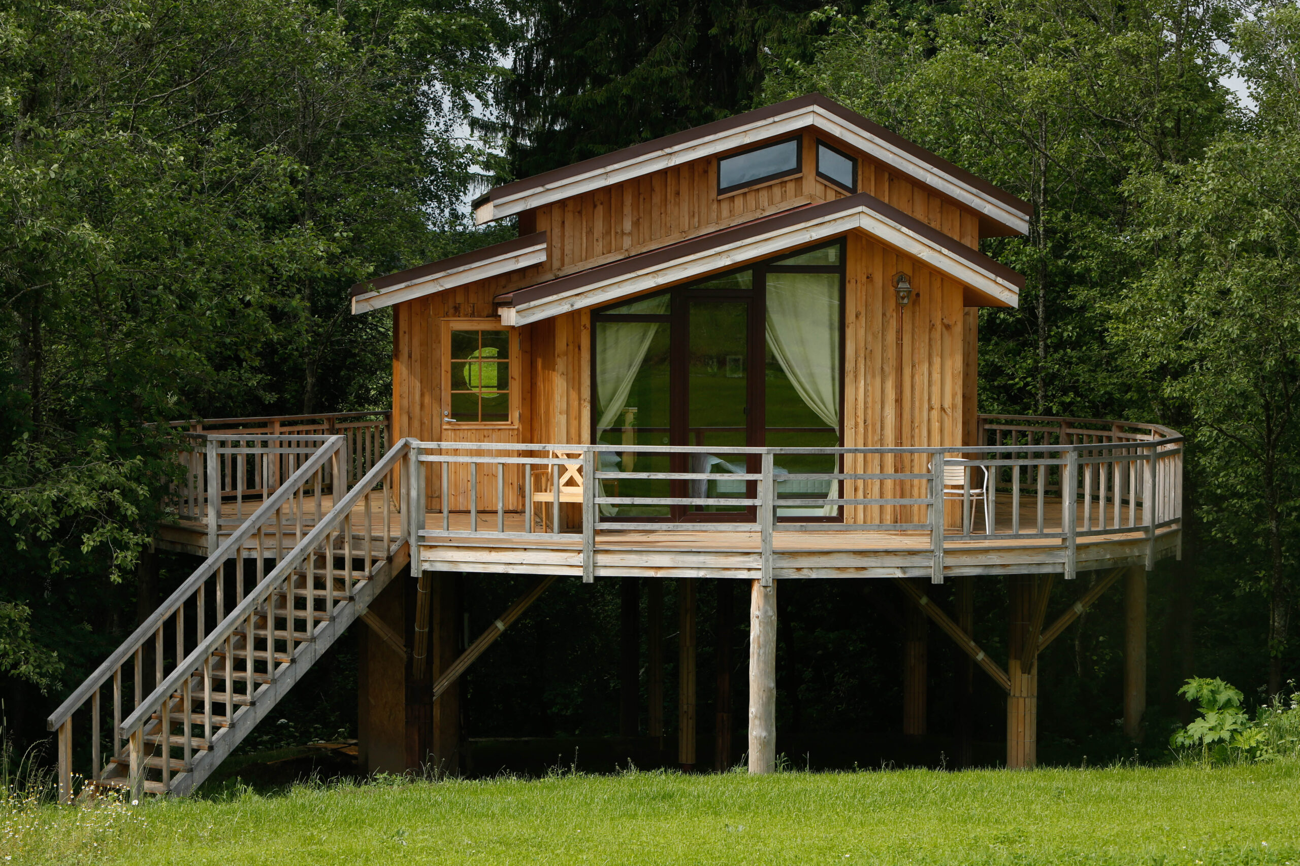 Первый в России экологический отель на деревьях: стволы проходят прямо внутри панорамных веранд домов. Коттеджи находятся на высоте от 2,5 до 7 метров над уровнем земли на природной возвышенности.