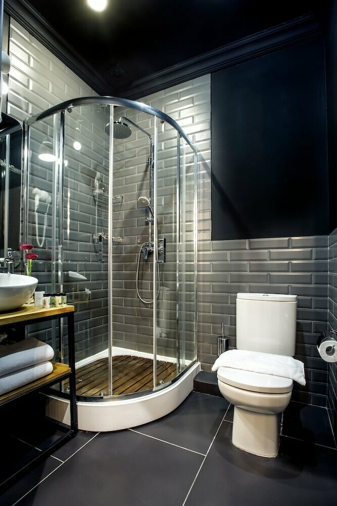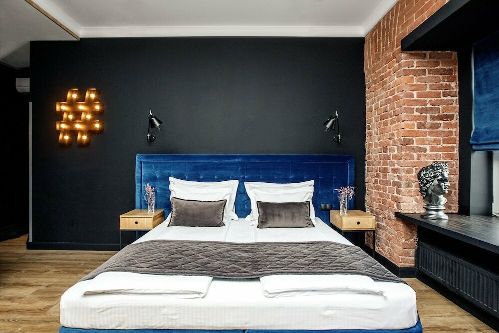 Отель расположился в историческом здании, построенном в 1861 году в стиле позднего классицизма. Высота потолков достигает 3,5 метров, создавая атмосферу простора и света в номерах. Интерьер оформлен в современных темных тонах с акцентами на натуральный кирпич и уютные кровати.