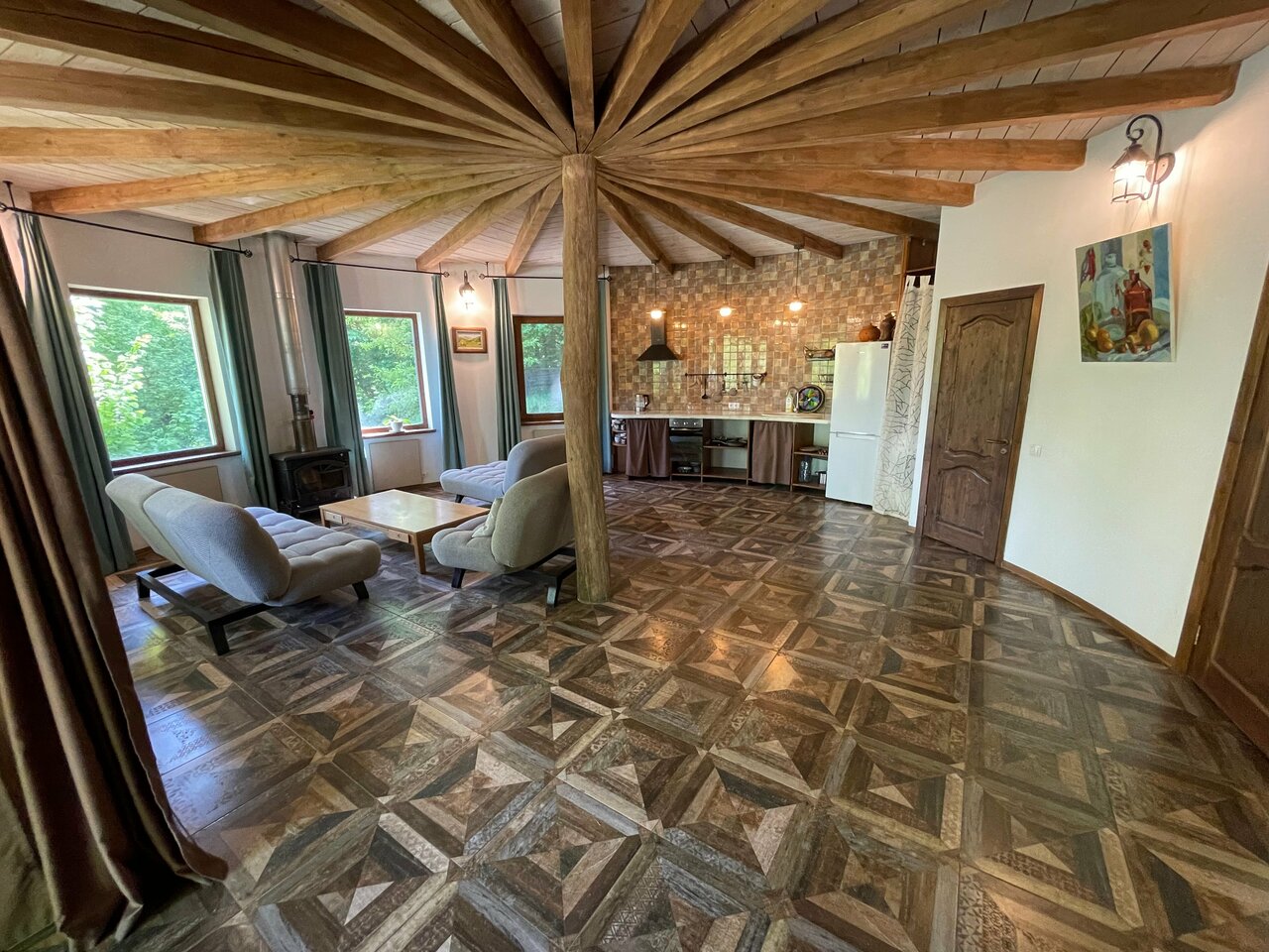 Круглый Дом в Горах предлагает комфортные номера с кондиционером, Wi-Fi, санузлом и холодильником. На кухне есть посуда, чайник, плита и кофеварка. Для отдыха доступны катание на лошадях, йога и бадминтон. Услуги включают массаж и звукотерапию тибетскими чашами. В саду можно отдохнуть в беседке или на гамаках. Оборудовано место для костра. Парковка и велопарковка имеются. В доме есть камин и зоны для барбекю. Прогулочные тропы ведут к водопадам и дольменам. В окрестностях находятся кафе "Мангал House", "Жаркий улов" и "Легенды", где подают разнообразные блюда. В Геленджике можно арендовать яхту или отправиться на морскую прогулку. В получасе езды доступны пляжи и развлечения города.