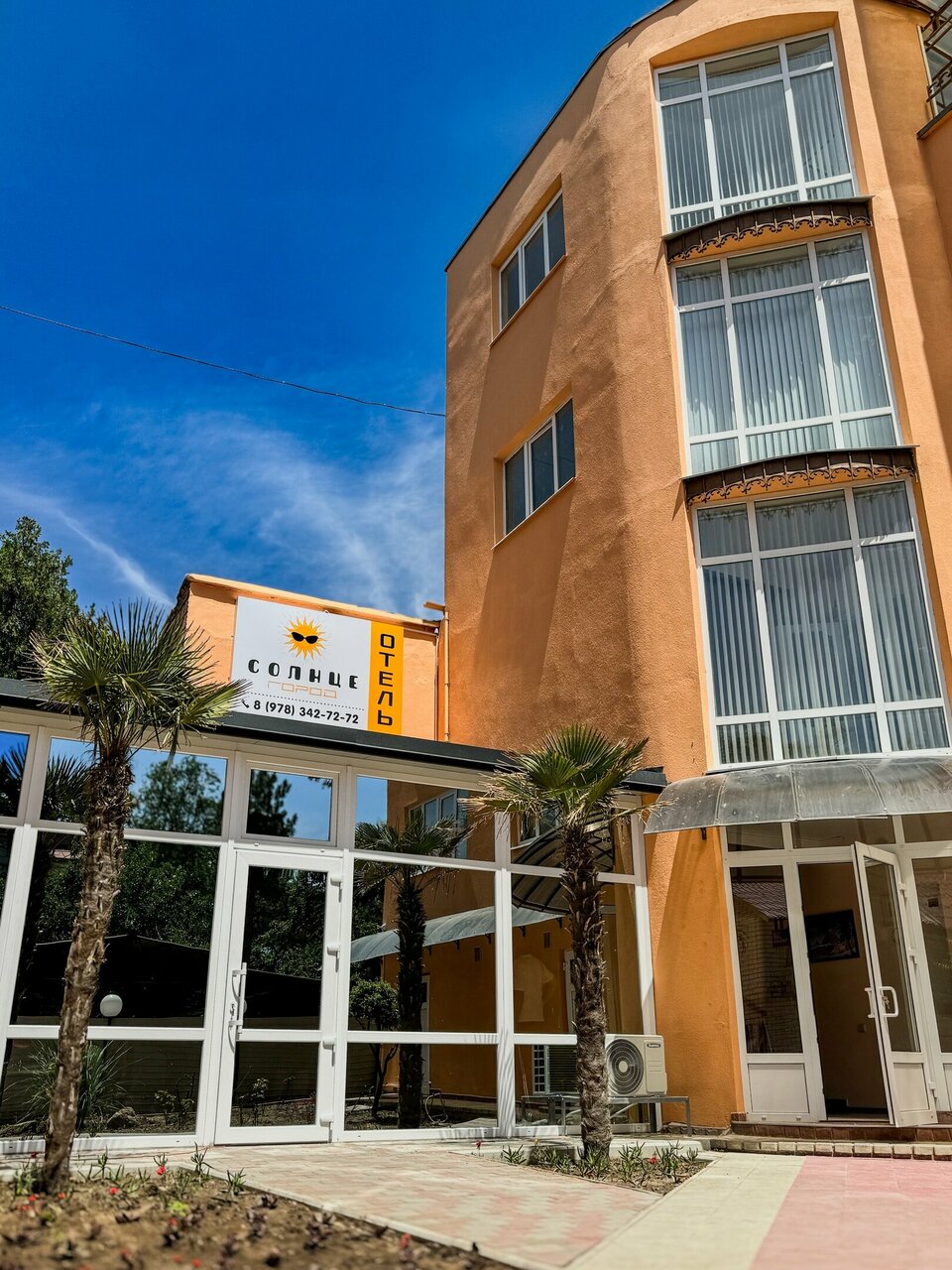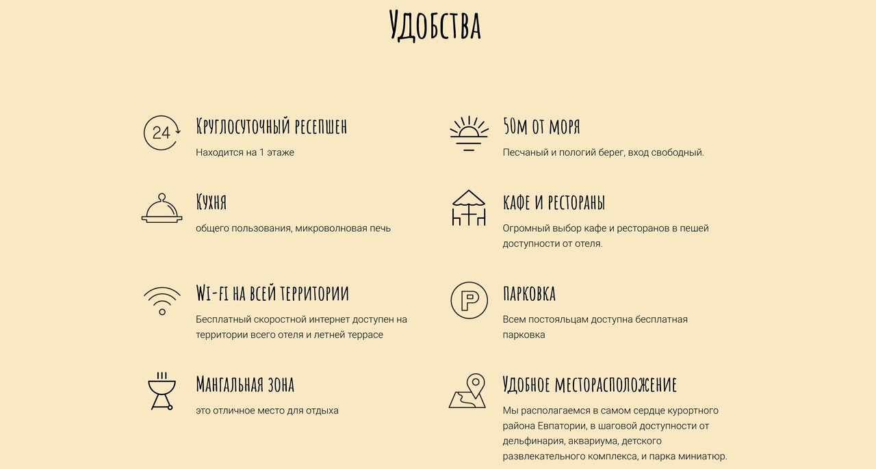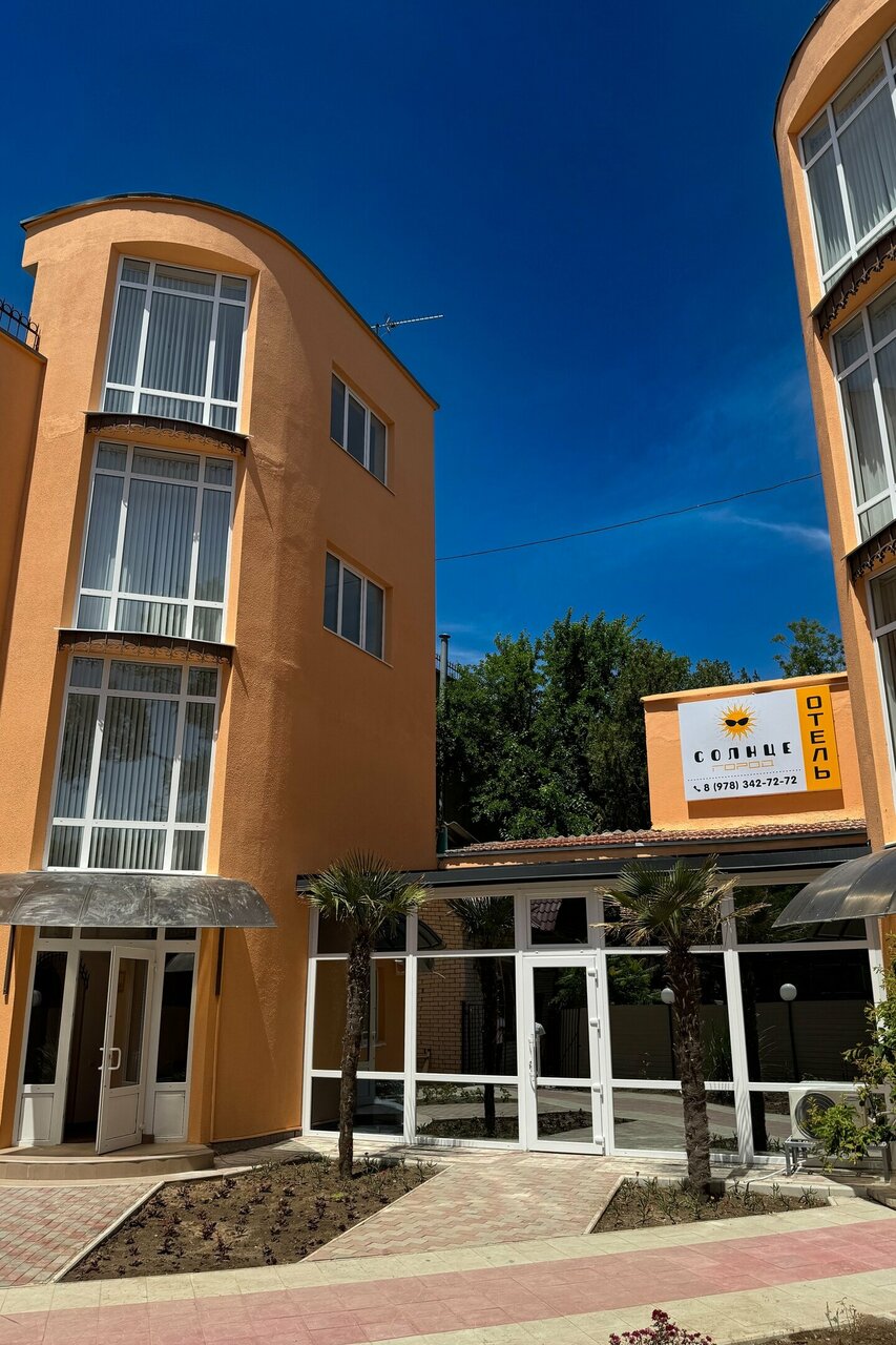 «Солнце Город» предлагает проживание в просторных номерах с новой мебелью, балконом, кондиционером, телевизором, холодильником и бойлером. На территории есть общая кухня с микроволновой печью и посудой, мангальная зона с навесом и столиками, стиральная машина. Предоставляется бесплатный Wi-Fi, круглосуточная подача воды, парковка для постояльцев. Проводится ежедневная уборка номеров, предоставляются комплекты белья и полотенец. Возможно проживание с животными до 5 кг по предварительному соглашению. Отель находится рядом с набережной и пляжем, вокруг много магазинов, кафе и развлечений. Территория ухоженная, чистая, с большим количеством зелени и цветов. В окрестностях — парк с аттракционами, скалодромами, скейт-площадкой и роллердромом. Работают Евпаторийский театр, детский театр «Золотой ключик», музей «Пираты Чёрного моря», аквариум с более чем ста видами рыб, черепахами, игуанами и другими животными. Также можно посетить Евпаторийский краеведческий музей и мечеть Джума-Джами.